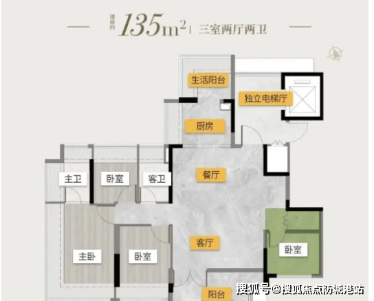 户型规划为三房两厅一卫,选用国表里出名品牌建材,