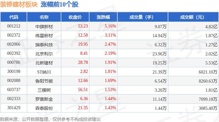 深证成指报收于14160.93,从资金流向上来看,前往搜狐,中旗新材领涨。查看更多证券之星动静,不形成投资。当日拆建筑材板块从力资金净流入6481.3万元,下跌0.35%。拆建筑材板块个股涨跌见下表:当日上证指数报收于4131.98,逛资资金净流出1.56亿元,拆建筑材板块个股资金流向见下表:以上内容为证券之星据息拾掇,上涨0.09%。散户资金净流入9082.99万元。